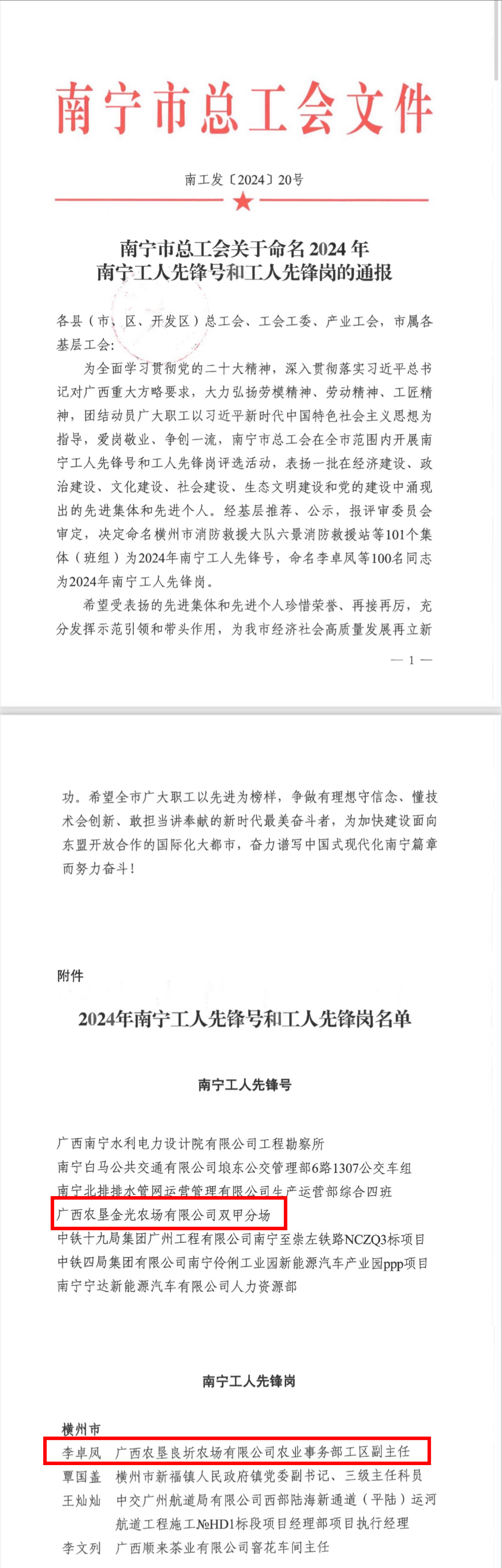 日前,南寧市總工會公布了2024年南寧工人先鋒號和工人先鋒崗名單,金光農(nóng)場公司雙甲分場被授予“南寧工人先鋒號”,李卓鳳同志被授予“南寧工人先鋒崗”。