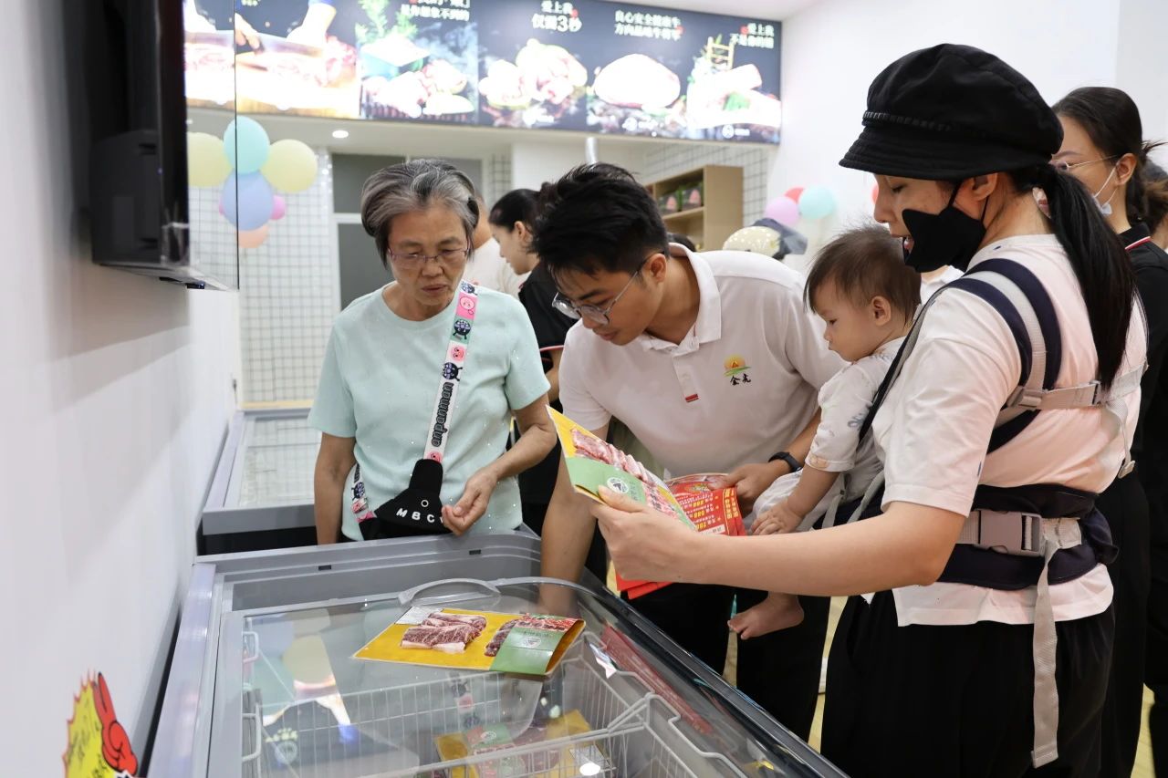 開業(yè)儀式現(xiàn)場雄獅舞吉祥,鑼鼓傳喜慶,鮮花芬芳彩旗高揚,吸引了眾多消費者前往體驗?!斑@個牛肉串香嫩爽口、奶香濃郁?!逼穱L銷售員遞來的試吃樣品后,市民李女士贊不絕口。走進店內(nèi),牛腱、牛腩、牛霖、牛排、牛肉丸、牛肉串等豐富多樣的牛肉產(chǎn)品琳瑯滿目,不少市民駐足挑選。