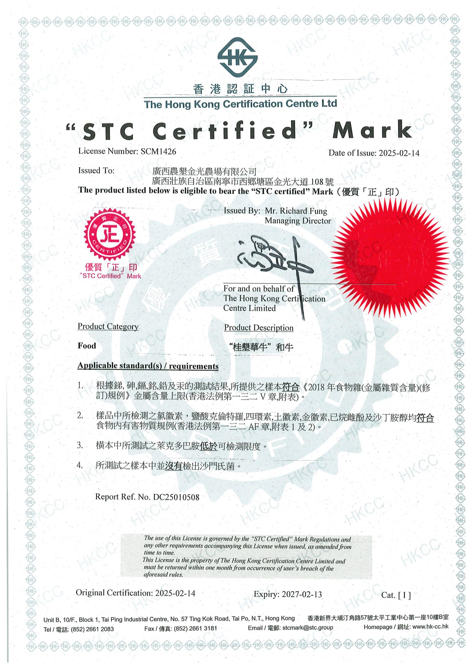 近日,金光農(nóng)場(chǎng)公司“金光一號(hào)”沃柑、“桂墾華牛”和牛獲香港標(biāo)準(zhǔn)及檢定中心(STC)頒發(fā)的香港優(yōu)質(zhì)“正”印認(rèn)證證書。這是繼2022年“金光一號(hào)”沃柑,2024年“金光一號(hào)”火龍果通過該項(xiàng)認(rèn)證后取得的又一突破,也標(biāo)志著“金光一號(hào)”系列產(chǎn)品、“桂墾華?!焙团5忍厣a(chǎn)品解鎖了打開香港乃至國(guó)際市場(chǎng)大門的通關(guān)密碼。
